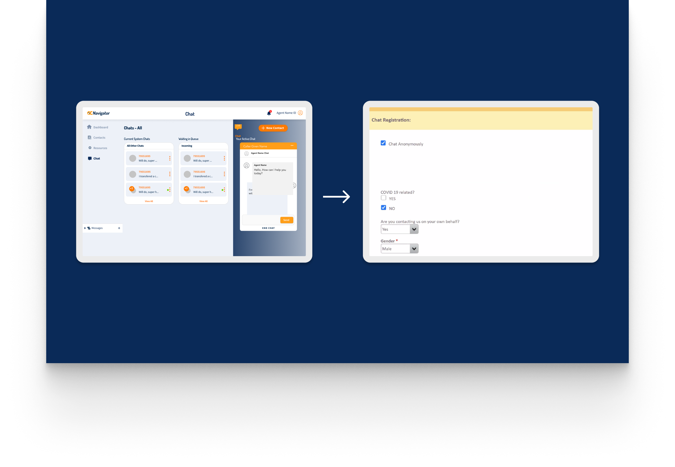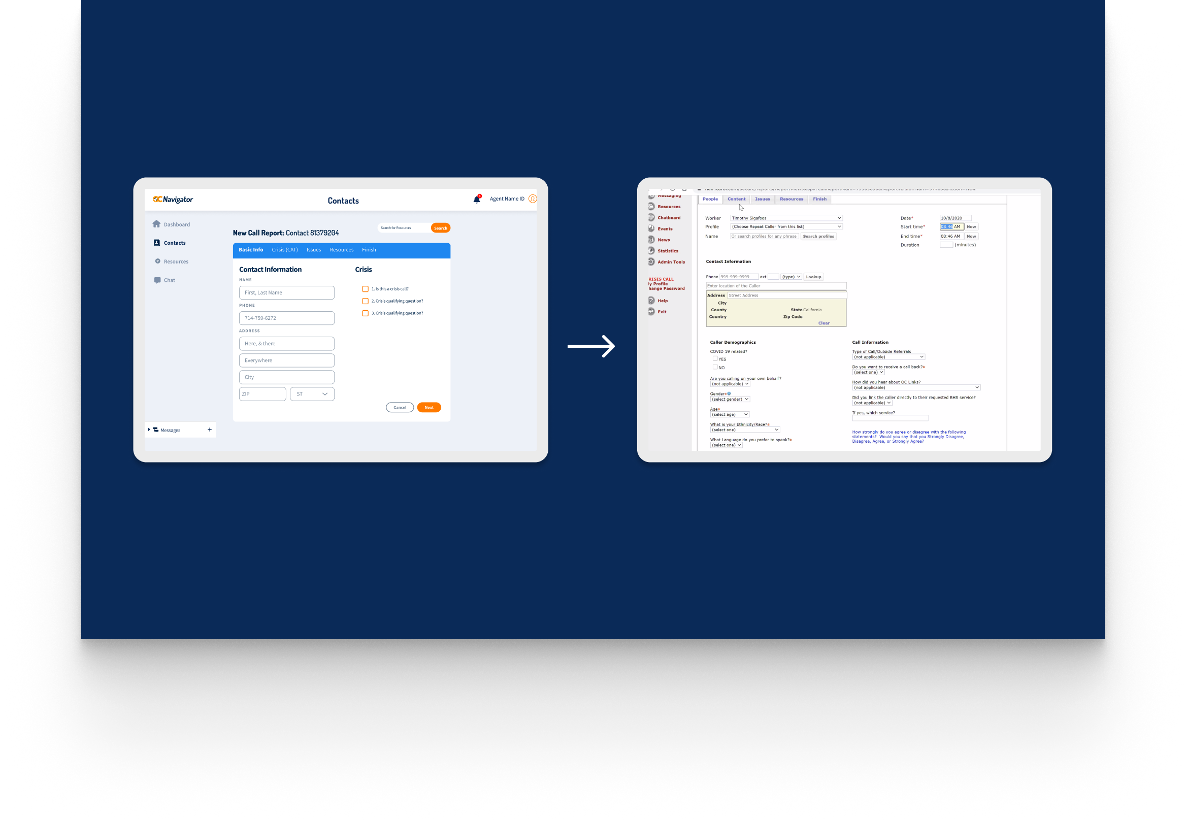 Crisis workers navigate contact intake, triage, referrals, and report documentation across desktop and mobile views. The workflow supports real-time coordination, allowing staff to log details, track follow-ups, and connect individuals to resources without losing context across different interaction points.