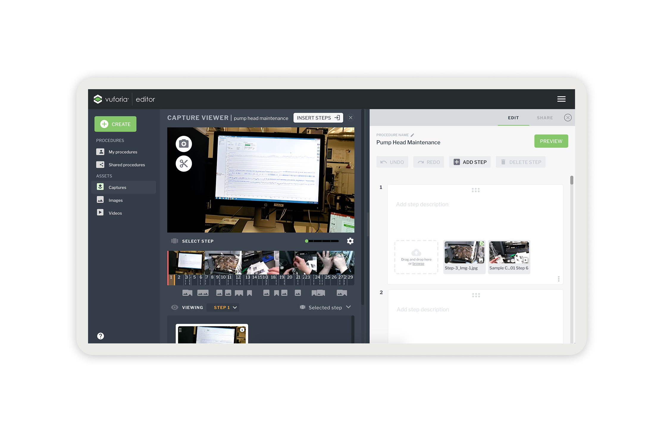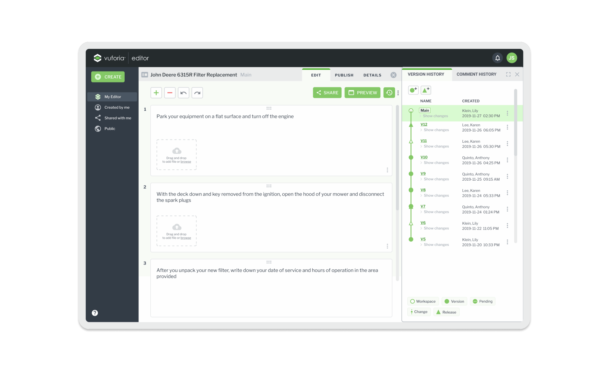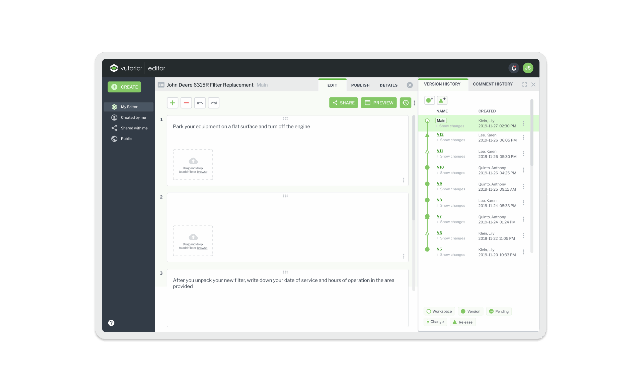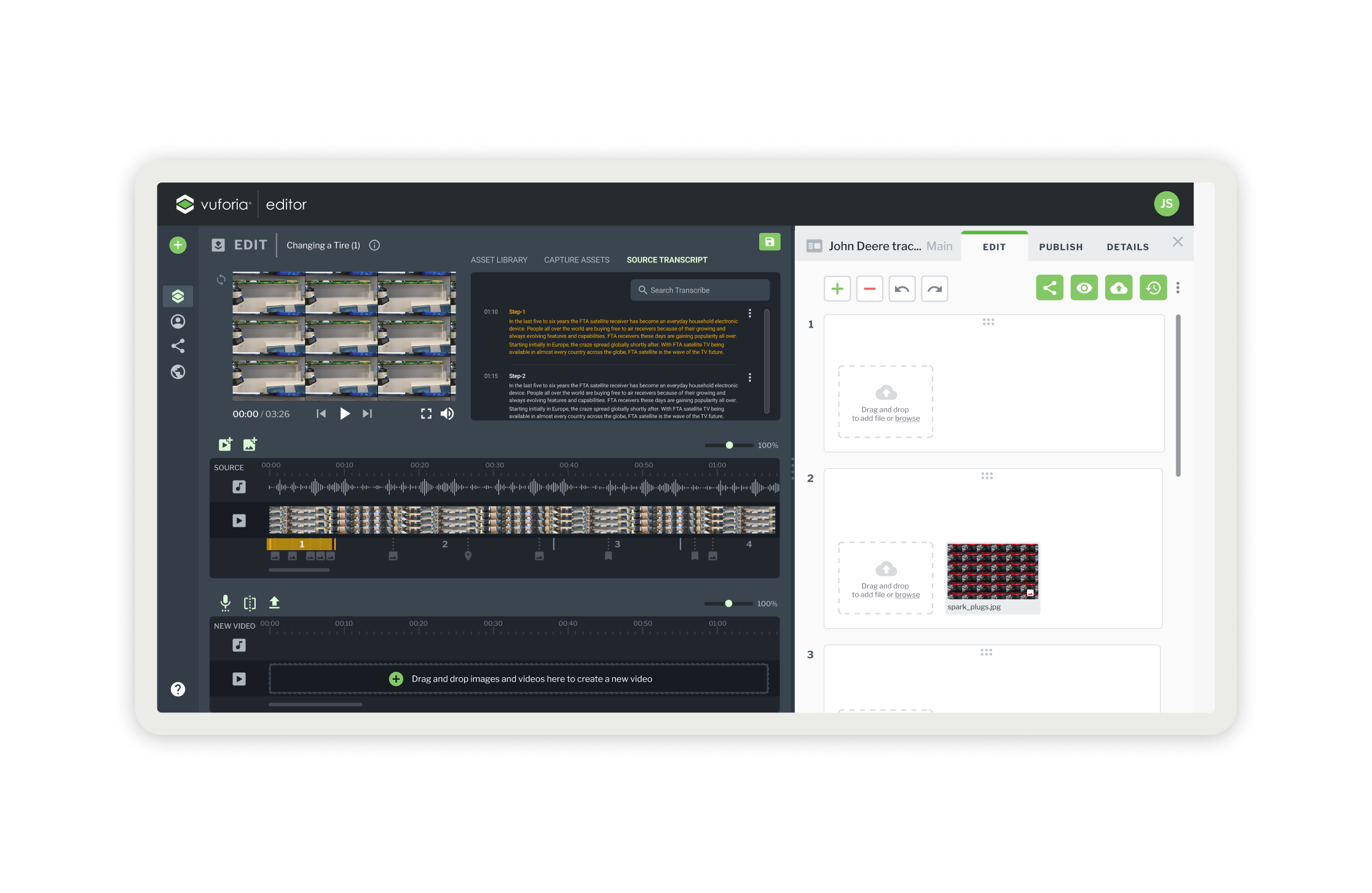 Vuforia Expert Capture is an easy-to-use SaaS AR solution designed to make frontline work more efficient. Vuforia Expert Capture enables companies to capture experts’ knowledge and leverage 3D CAD to easily create, deliver, and scale interactive work instructions and AI-enhanced inspections. Vuforia Expert Capture is a connected worker platform designed to bridge the gap between the physical and digital worlds through a cohesive three-part ecosystem. It begins with Capture, utilizing RealWear and HoloLens headsets to record raw footage directly in the field, and extends to View, the playback engine that delivers guidance to frontline workers. However, the core of my work centered on the Vuforia Editor (The Hub)—a secure SaaS web application that serves as the critical “middle layer” where messy reality is transformed into trusted business data. I helped design this web-based “refinement engine,” architecting the workflows that turn raw AR video into compliant, audit-ready operating procedures using AI transcription and rigorous governance.