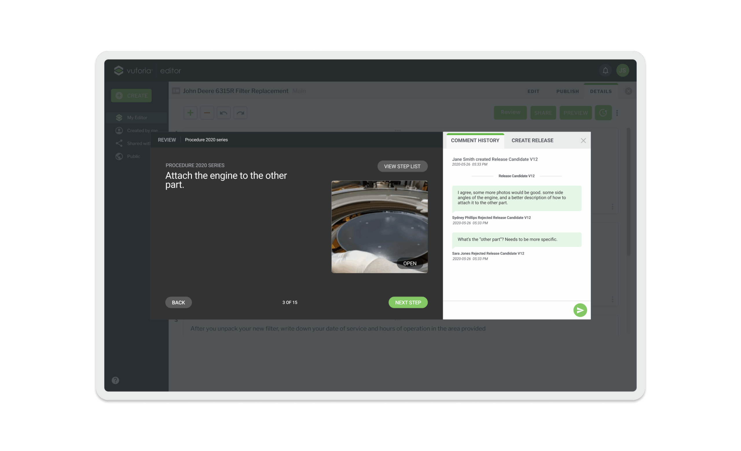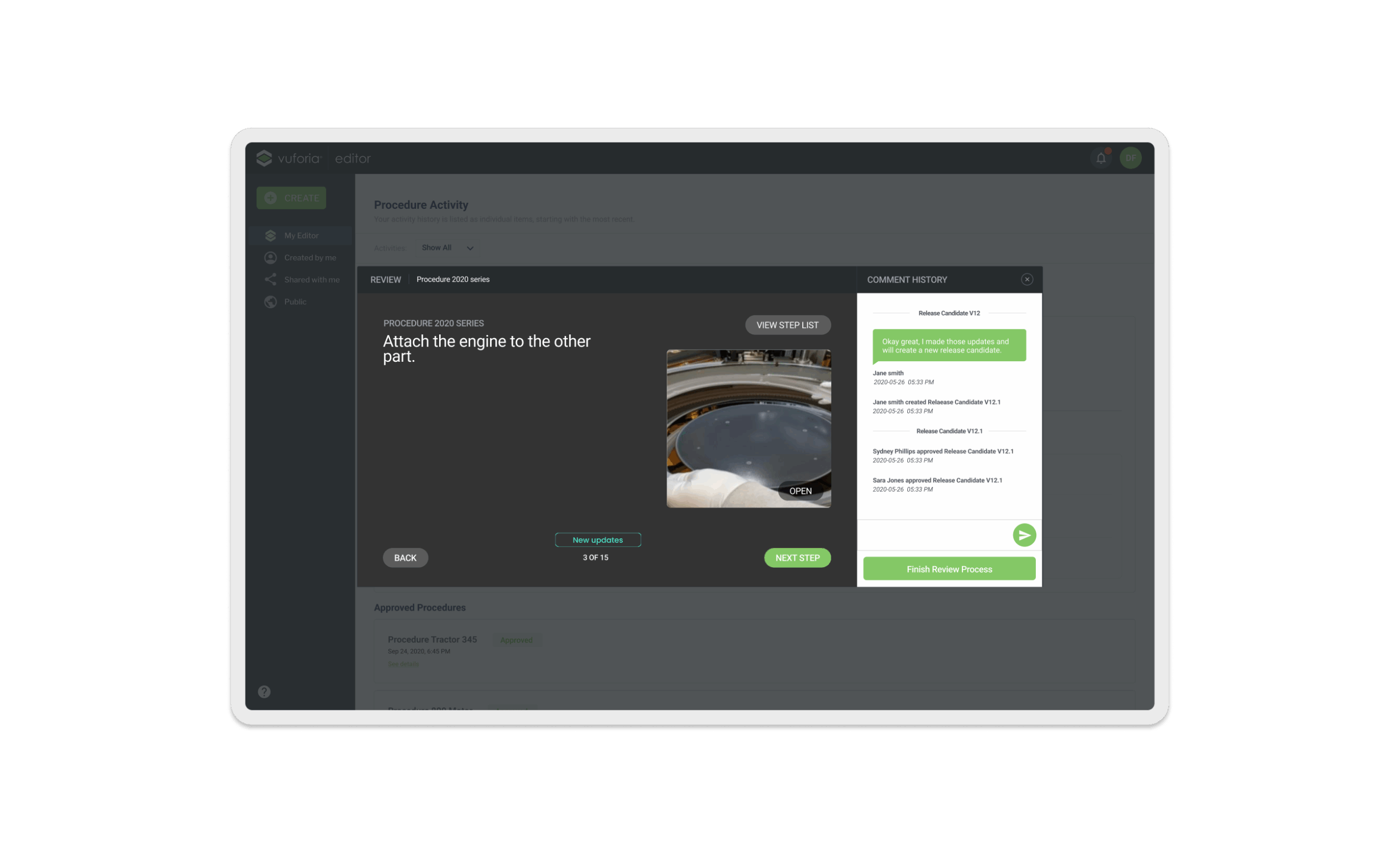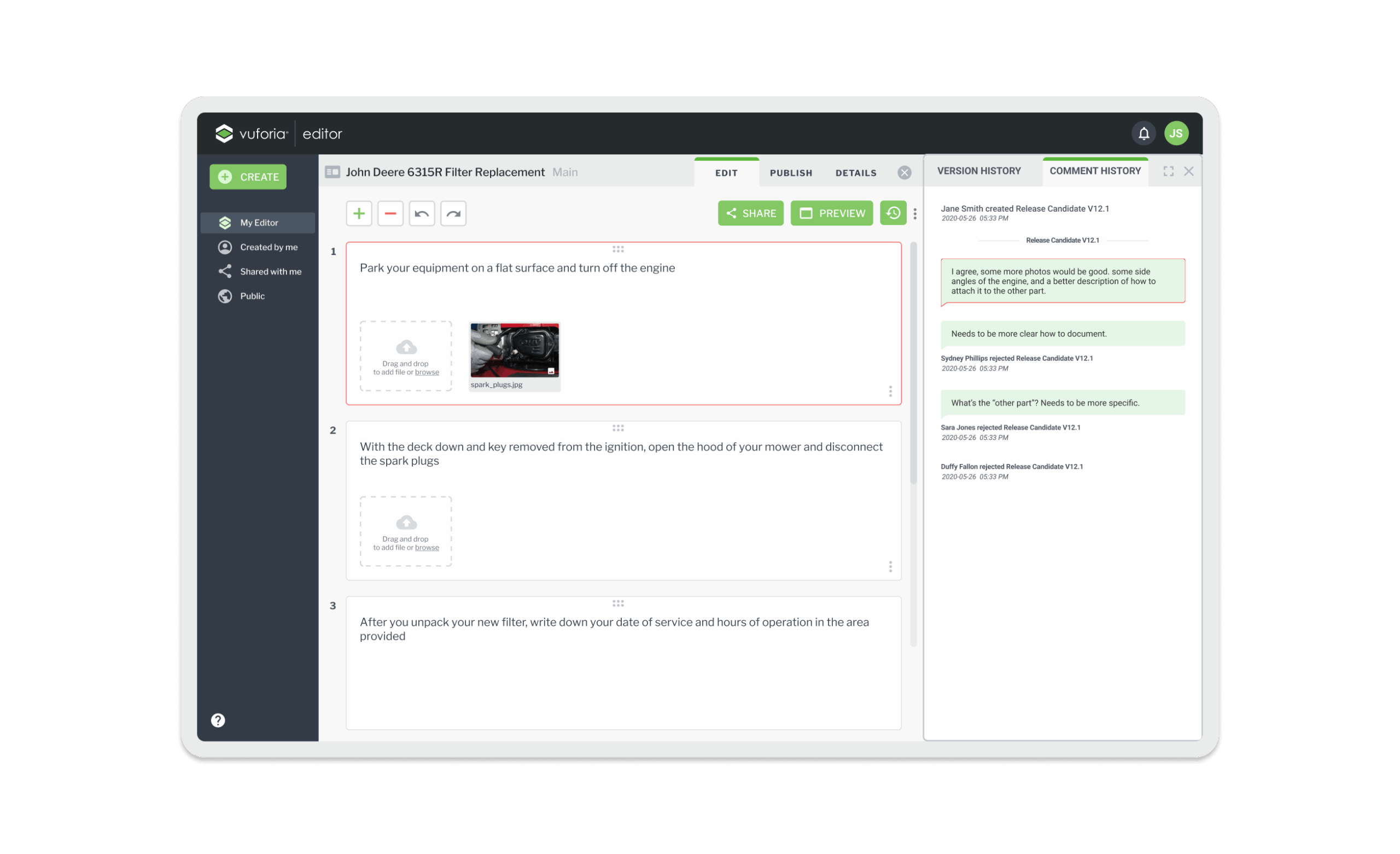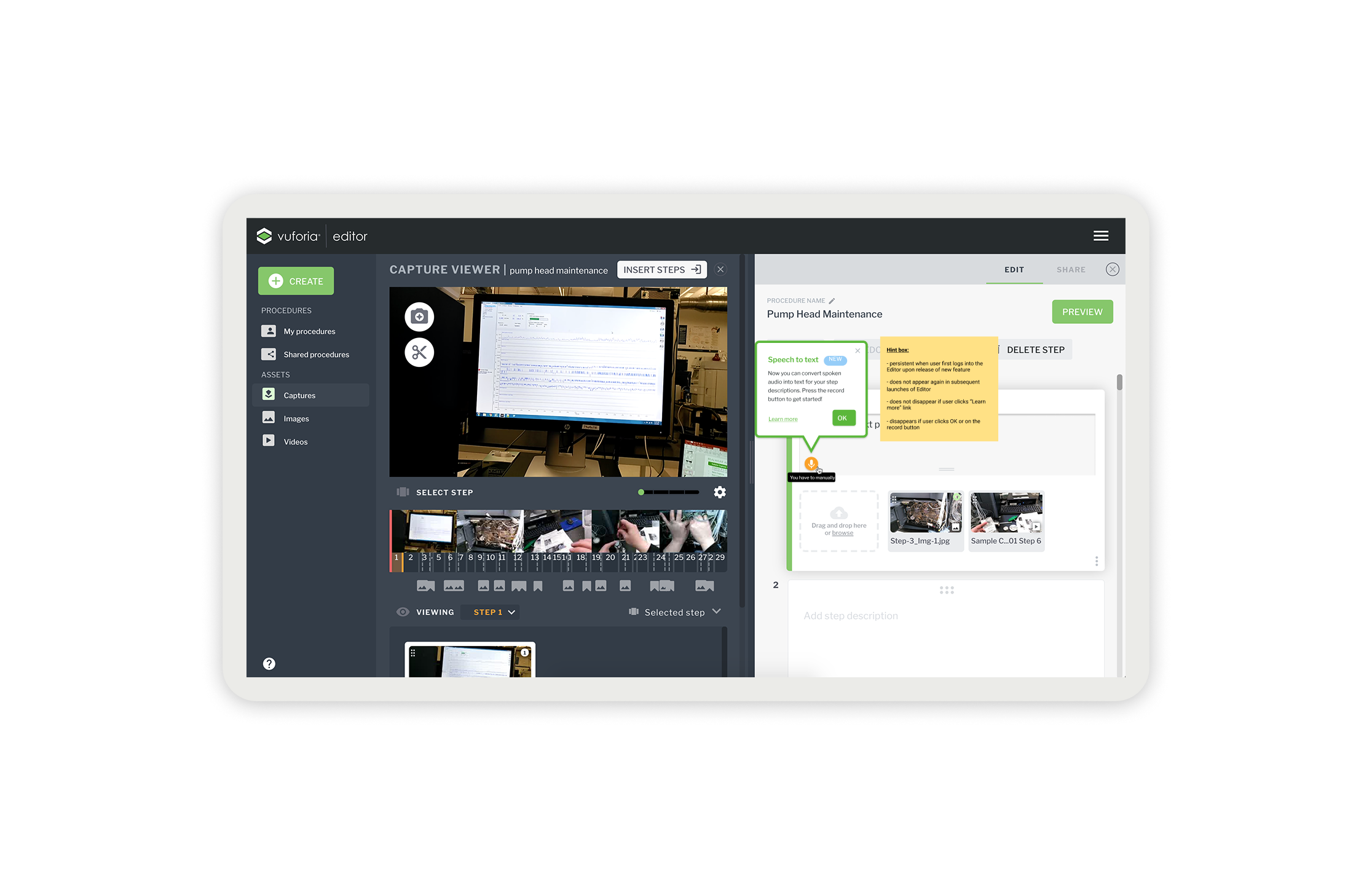 Vuforia Expert Capture is an easy-to-use SaaS AR solution designed to make frontline work more efficient. Vuforia Expert Capture enables companies to capture experts’ knowledge and leverage 3D CAD to easily create, deliver, and scale interactive work instructions and AI-enhanced inspections. Vuforia Expert Capture is a connected worker platform designed to bridge the gap between the physical and digital worlds through a cohesive three-part ecosystem. It begins with Capture, utilizing RealWear and HoloLens headsets to record raw footage directly in the field, and extends to View, the playback engine that delivers guidance to frontline workers. However, the core of my work centered on the Vuforia Editor (The Hub)—a secure SaaS web application that serves as the critical “middle layer” where messy reality is transformed into trusted business data. I helped design this web-based “refinement engine,” architecting the workflows that turn raw AR video into compliant, audit-ready operating procedures using AI transcription and rigorous governance.
