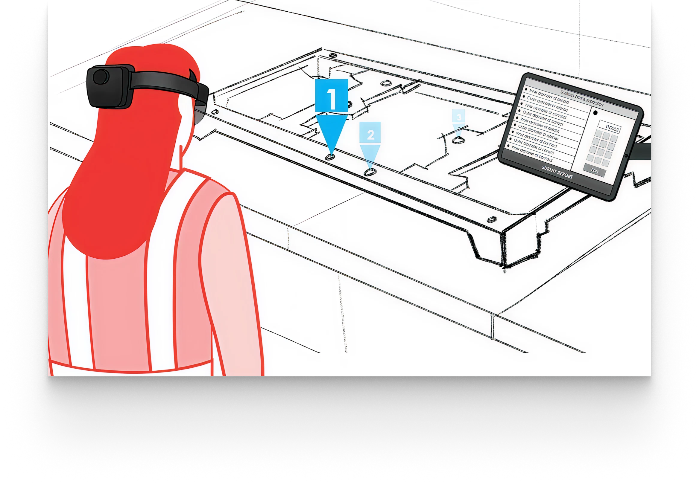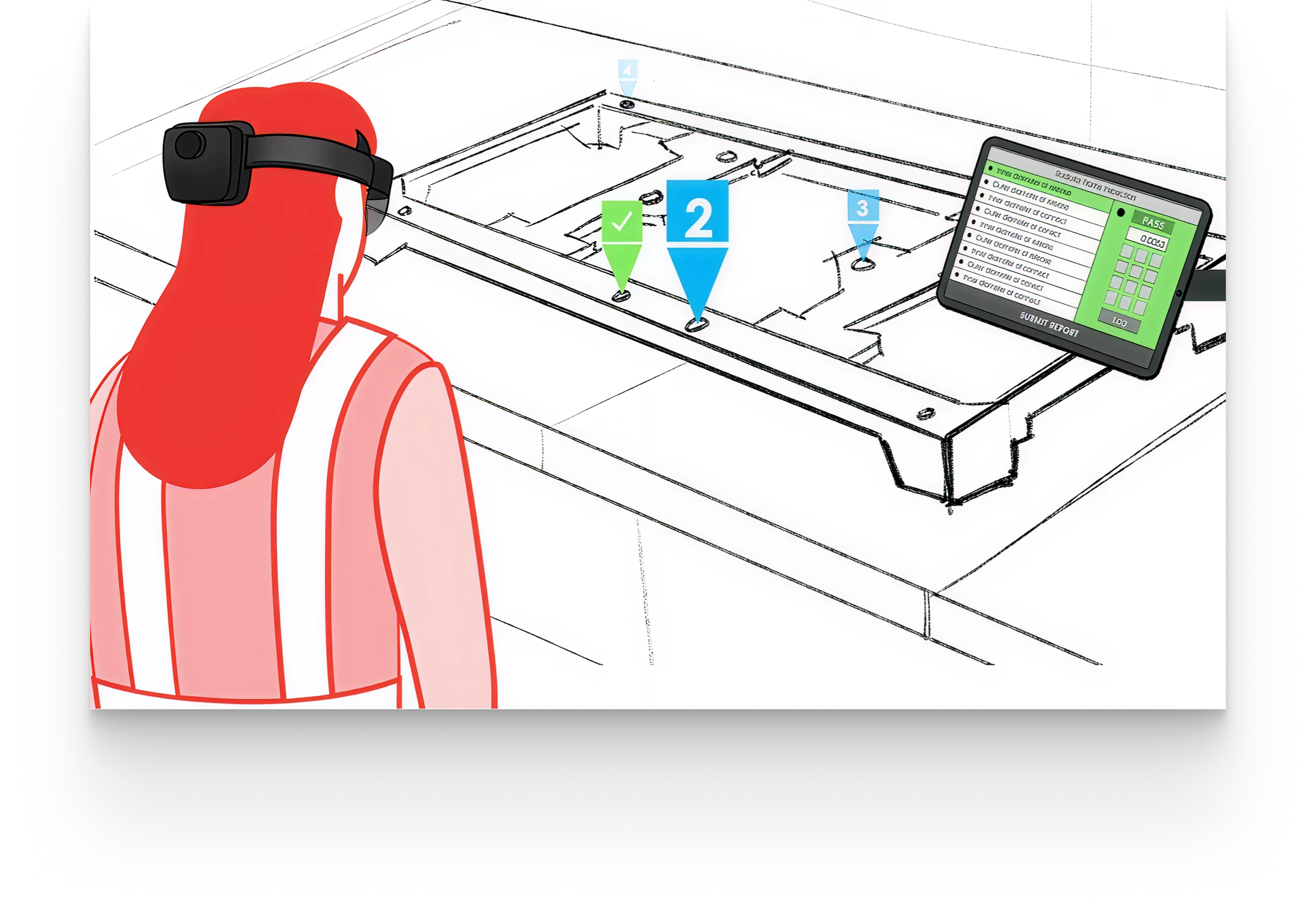 An augmented inspection for technicians, guiding them through checks, real-time confirmations, and hands-free notes. The tablet and headset sync appears to cut down on missed steps and turns a messy process into clearer instructions to follow.